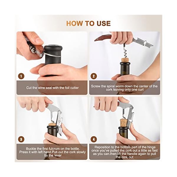 🍷【Ein idealer Weinflaschenöffner】Der gezackte Folienschneider kann die Folie am Weinflaschenverschluss leicht schneiden. Der Doppel-Scharniere sorgt für zusätzliche Hebelwirkung, erleichtert das Öffnen des Weines und hat einen deutlichen mechanischen Vorteil gegenüber dem alten Einscharnier-Scharniere.
