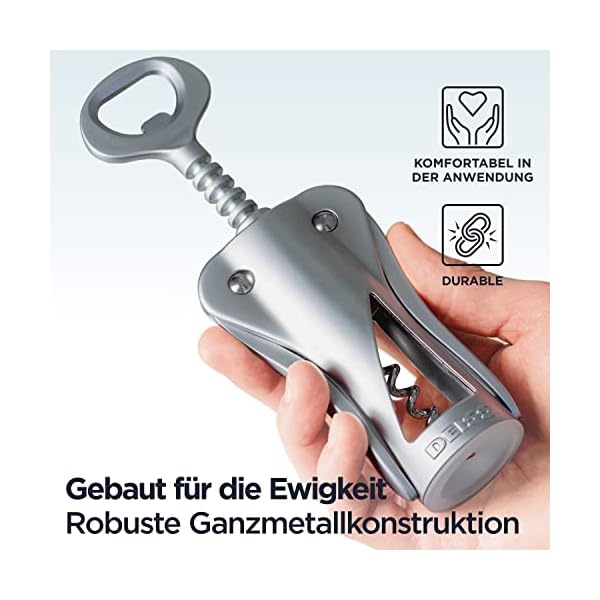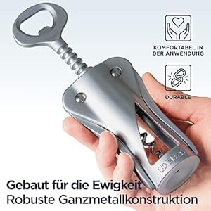 ✅ ROBUSTE GANZMETALLKONSTRUKTION – Im Gegensatz zu anderen Korkenziehern für Weinflaschen auf dem Markt, die Kunststoffkörper, Nieten oder Einsätze haben, ist der Deiss Weinkorkenöffner mit seiner robusten Ganzmetallkonstruktion für eine lange Lebensdauer gebaut (was ihn zu einem erstklassigen Flaschenöffner für Barkeeper macht). Er ist perfekt ausbalanciert, um den Korken leicht zu entfernen und macht das Öffnen Ihrer Lieblingsflasche zum Kinderspiel. Sie müssen sich nicht mehr abmühen, den Korken herauszubekommen oder sich Sorgen machen, dass die Plastikteile brechen.
