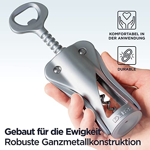 Deiss LUX Weinöffner, Ganzmetall-Flügelkorkenzieher-Weinflaschenöffner mit integriertem Bierflaschenöffner – Ergonomischer Korkenzieher-Weinkorker, Silber-Matt-Beschichtung, Samt-Aufbewahrungsbeutel