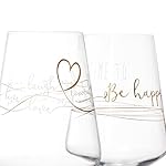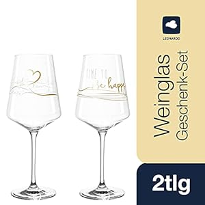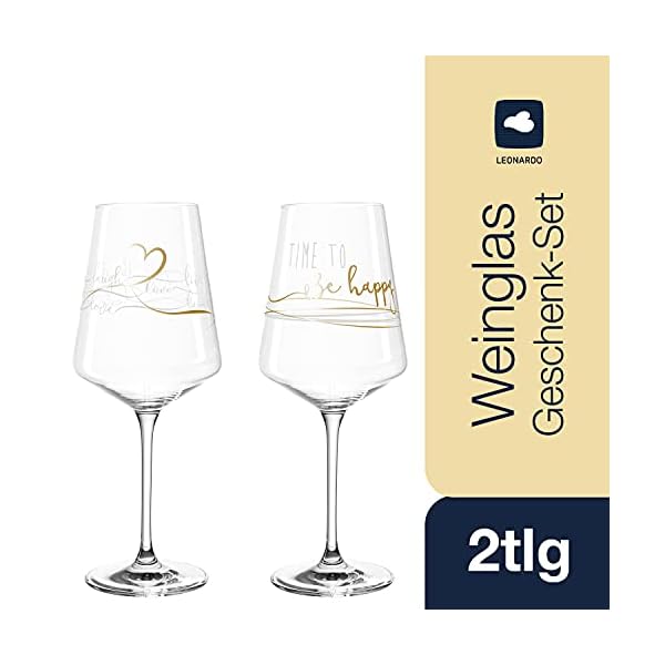 Hochwertiges Design: Der goldene Aufdruck Time to be happy rundet das erste Glas-Design ab, Ein goldenes Herz und Linien mit Love-Schriftzügen veredelt den zweiten Wein-Kelch, Dank der von Leonardo entwickelten Teqton-Glasrezeptur ist das Weißwein-Set besonders robust und stoßfest