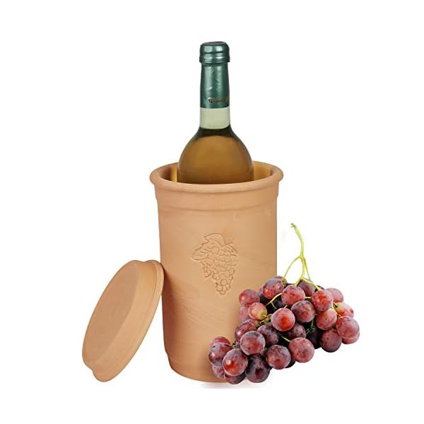 MamboCat Offen-Wein-Kühler – ein Must Have für jeden Weinkenner ! Unser Tisch Kühler für Getränke sorgt mit natürlicher Raffinesse für eine optimale Wein-Temperatur und paßt für alle Standardflaschen. Der Wein- und Getränkekühler Retro funktioniert ganz einfach: Sie füllen kaltes Wasser in das Tongefäß und warten ca. 15 Minuten und gießen es aus. Nun wirkt Ihr Flaschen Tischkühler wie ein Kältespeicher und die natürliche Verdunstung sorgt für die Kühlung Ihres Lieblingsgetränkes. Sorgen Sie für Urlaubsfeeling mit dem Weinkühler aus Ton mit der eingebrannten Weinrebe auf dem zylindrischen Körper – mediterraner Stil bei einem gemütlichen Abend am Kamin mit einem Gläschen Wein oder Sekt. Wer eine stilvolle Weinprobe durchführen möchte braucht Wein Becher aus Ton und ein Terrakotta Gefäß zum Kühlen. Im Partyservice und Catering Zubehör – in der Hotel Ausstattung – in der Weinstube um die Ecke – im Gastronomie Bedarf und für die Tischdeko im Restaurant ist unser Weinkühler Ton Terracotta unverzichtbar. Der Party Getränke Kühler ist sehr vielseitig einsetzbar z.B. als exquisites 2 teiliges Set Barzubehör – der perfekte Kühler für Bierflaschen – Outdoor Getränkekühler auf der nächsten Gartenparty – Weinflaschen Kühler für Ihre Spirituosen Verkostung – Kühler für Flaschen mit einem Durchmesser von 9 cm auf Ihrem schön gedeckten Esstisch – Mitbringsel zur Wohnungseinweihung – Überraschung zur Hochzeit – gut bestückt mit einer Flasche Sekt – edles Geschenk an Stammkunden uvm. Der Weinkühler & Sektkühler im Detail: 1x Tisch Getränke Kühler; Material: Ton; Farbe rotbraun terracotta ; oben Ø 12,5 cm; Höhe 20 cm; Gewicht; 890 g; -1x Untersetzer – Farbe: warmes natürliches Braun; Spiegel Ø 12,5 mm; Höhe 0,7 cm; Gewicht; 160 g; Gesamt-Gewicht; 1.050 g; Unser Sortiment für Küche Haushalt & Wohnen hat noch viele weitere nützliche Alltagsgegenstände und praktische Haushaltshelfer aller Art.