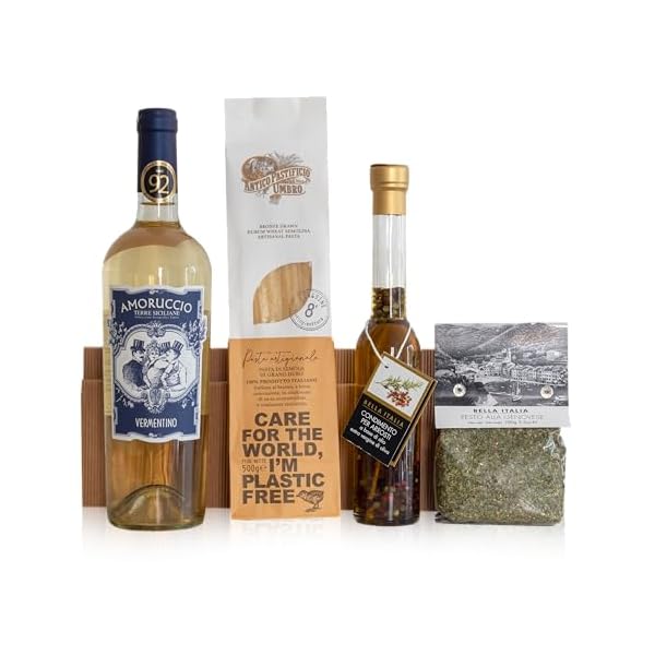 talienisches Gaumenfreuden Geschenkpaket – Exquisites Wein- und Pastaerlebnis Willkommen zu unserem exklusiven Geschenkpaket “La Dolce Vita Italien” – die perfekte Kombination aus köstlichen Aromen, handverlesenen Zutaten und dem Charme der italienischen Küche. Diese sorgfältig kuratierte Auswahl bietet nicht nur ein unvergleichliches Geschmackserlebnis, sondern auch eine Reise durch die kulinarische Vielfalt Italiens. Inhalt des Geschenkpakets: Amoruccio Vermentino Siciliane IGT (750ml): Genießen Sie die Sonne Siziliens in jeder Schluck dieses erlesenen Vermentino-Weins. Die fruchtigen Zitrusnoten und floralen Nuancen machen ihn zum idealen Begleiter für leichte Mahlzeiten und gesellige Momente. Antico Pastificia Umbro Linguine (500g): Unsere handgefertigten Linguine sind eine Hommage an die italienische Pasta-Tradition. Perfekt al dente gekocht, nehmen sie Saucen wunderbar auf und sorgen für ein authentisches Geschmackserlebnis. Bella Italia Olivenöl extra mit Pfeffer und Rosmarin (200ml): Verfeinern Sie Ihre Gerichte mit dem aromatischen Olivenöl, das die Sonne Italiens einfängt. Die Kombination aus Pfeffer und Rosmarin verleiht Ihren Speisen eine mediterrane Note. Gewürzmischung “Spaghetatta” (100g): Unsere sorgfältig abgestimmte Gewürzmischung verleiht Ihren Gerichten den unverwechselbaren Geschmack Italiens. Perfekt für die Verfeinerung von Pastasaucen, Fleischgerichten und mehr. Erleben Sie Italien in seiner kulinarischen Pracht mit unserem “La Dolce Vita Italien” Geschenkpaket. Ob als Geschenk für besondere Anlässe oder um sich selbst zu verwöhnen – dieses Paket bietet die Essenz der italienischen Genusskultur. Holen Sie sich diese Gaumenfreuden nach Hause und entdecken Sie die Freude an erlesenen Zutaten und unvergesslichen Geschmackserlebnissen. Bestellen Sie noch heute und tauchen Sie ein in die Welt der italienischen Delikatessen!