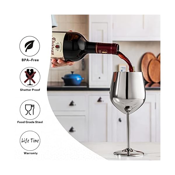 【Stilvoll und Exquisitität】- Diese Edelstahlweingläser sind künstlich hochpoliert, wodurch sichergestellt wird, dass jedes Weinglas eine hochwertige Galvanikfärbung und eine ausgezeichnete Metallstruktur hat. Die große Kapazität von 540 ml, breite und flache Basis erhöht die Stabilität, und der lange Stiel unterstreicht die Eleganz des Metallweinglases, so dass Sie das Glas leicht schütteln und das Aroma von Wein freisetzen können.